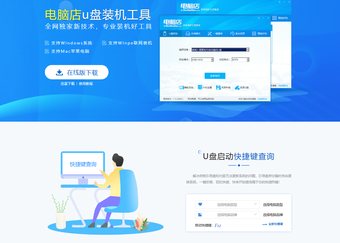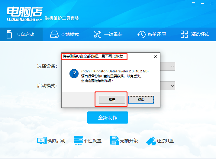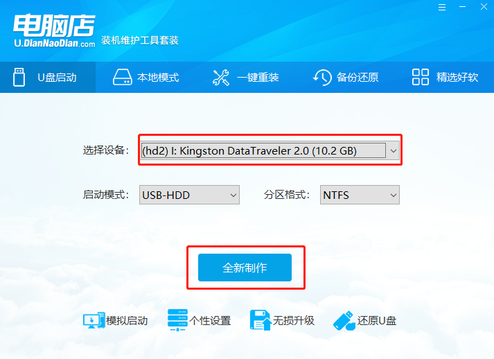 1、電腦插上U盤(pán),打開(kāi)“電腦店U盤(pán)啟動(dòng)盤(pán)制作工具”,(如沒(méi)有特殊的制作要求,使用默認(rèn)的模式與格式即可)點(diǎn)擊“全新制作”