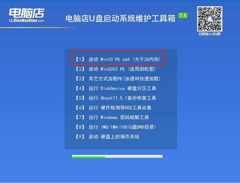 9、進(jìn)入電腦店主菜單后,通過(guò)“↑↓”鍵選擇“【1】啟動(dòng)Win10 X64PE(2G以上內(nèi)存)”后回車確認(rèn),成功進(jìn)入電腦店pe界面。