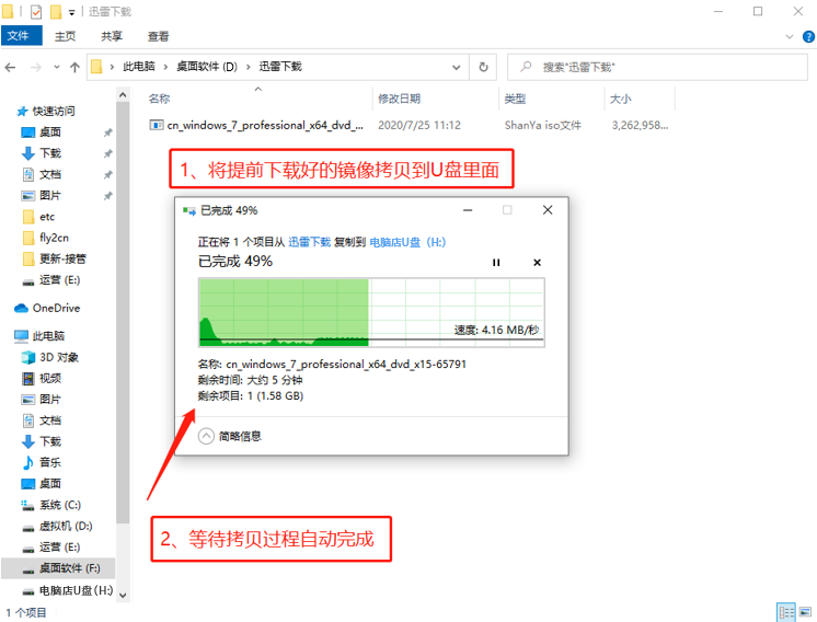 6、下載完成后,找到下載好的WIN7 ISO/GHO鏡像拷貝到U盤(pán)目錄,由于ISO/GHO文件通常都比較大,可能需要等待5~10分鐘。