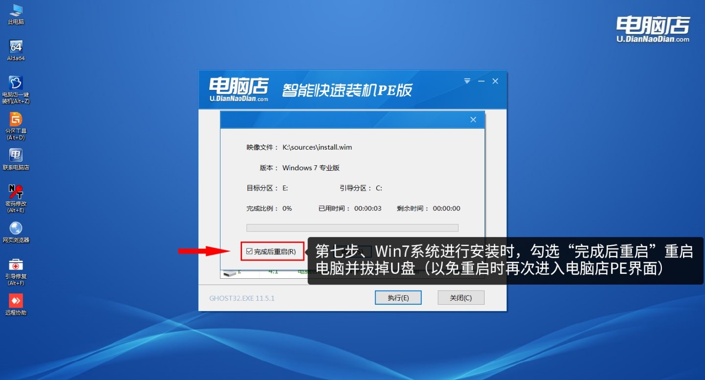 第七步、Win7系統(tǒng)進(jìn)行安裝時(shí),勾選“完成后重啟”,在完成后,電腦自動(dòng)重啟時(shí)拔掉U盤(pán)(以免重啟時(shí)再次進(jìn)入大電腦店P(guān)E界面)